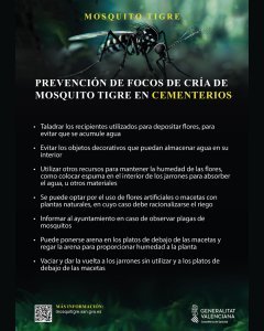 La Conselleria de Sanidad de la Generalitat Valenciana recuerda la importancia de la prevención y la actuación frente a focos del Mosquito Tigre en cementerios.