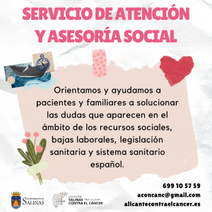 📑 El servicio de atención y asesoría social que ofrecen las Asociaciones de Alicante Contra el Cáncer y Salinas Contra el Cáncer tiene como objetivo orientar y ayudar a los pacientes y familiares a solucionar las dudas que aparecen en el ámbito de los recursos sociales, bajas laborales, legislación sanitaria y sistema sanitario español.