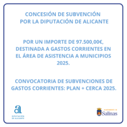 La Diputación de Alicante ha concedido al Ayuntamiento de Salinas una subvención por un importe de 97.500,00€, destinada a gastos corrientes en el área de asistencia a municipios 2025.