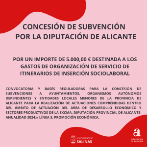 La Diputación de Alicante ha concedido una subvención al Ayuntamiento de Salinas en el área desarrollo económico y sectores productivos de la Diputación de Alicante.